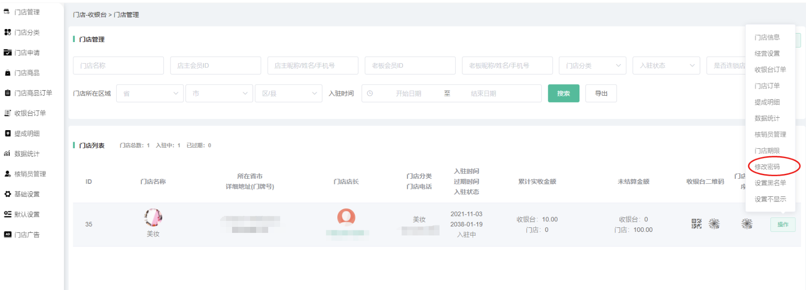 申请通过/后台添加的门店,在门店信息显示,可搜索查看门店的id、名称、所在省市详细地址、门店店长、门店分类、入驻时间、累计实收金额、未结算金额、收银台二维码、门店小程序码等