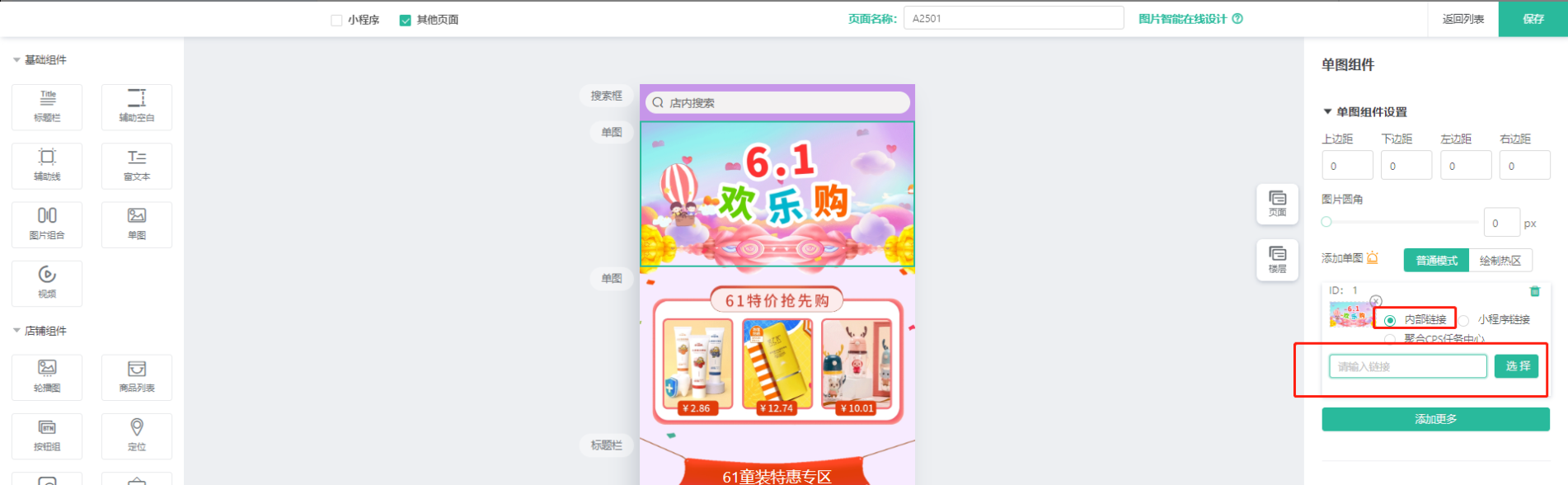 在装修DIY插件中设置H5链接,DIY小程序页面时,跳转链接选择内部链接,放置跳转链接。