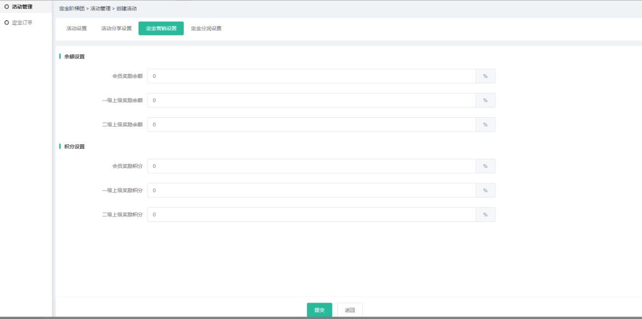 (4)营销设置和分润可设置活动定金的营销及分润信息,相应插件如未开启,则无法     设置,分润中所有插件都没开启则不会有分润设置导航;
