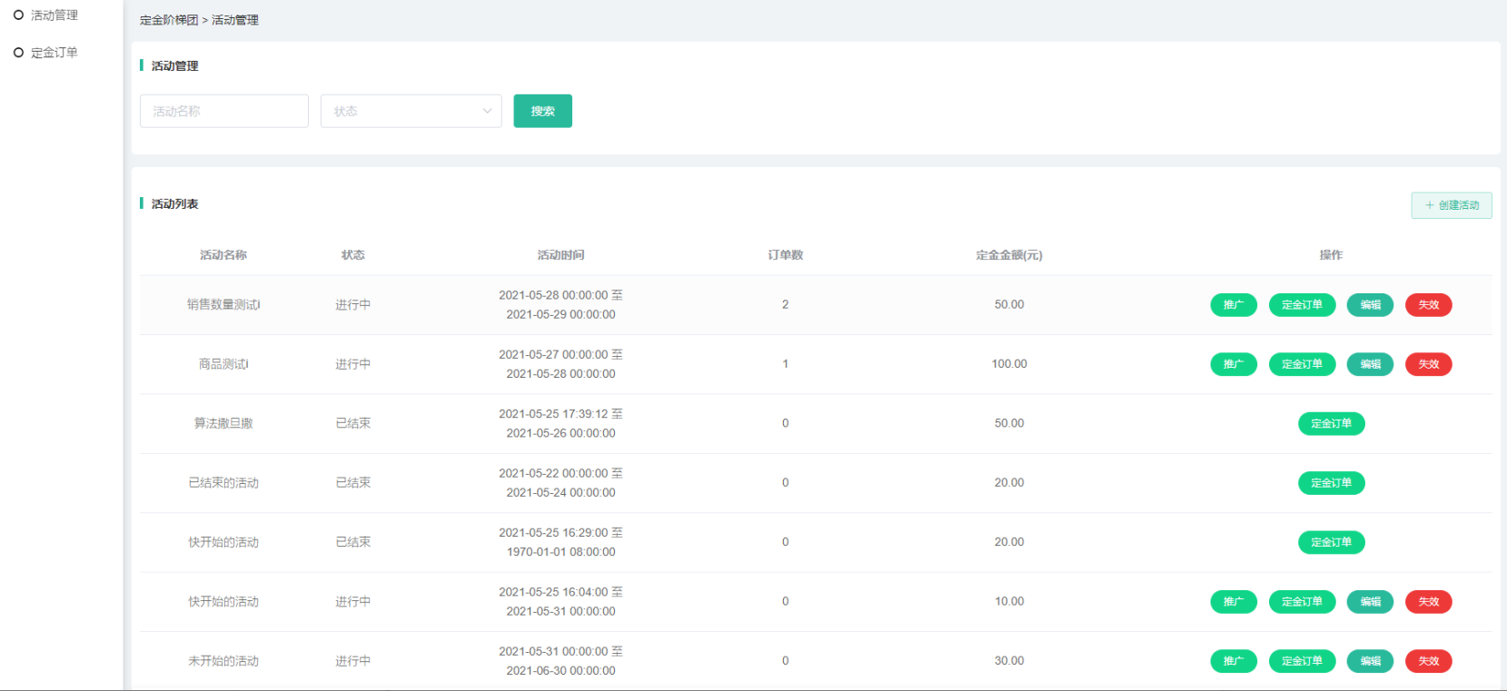 (3)进行中或者自动下单失败的活动可以点击失效,活动会失效,并把活动的定金订 单全部退款并关闭;