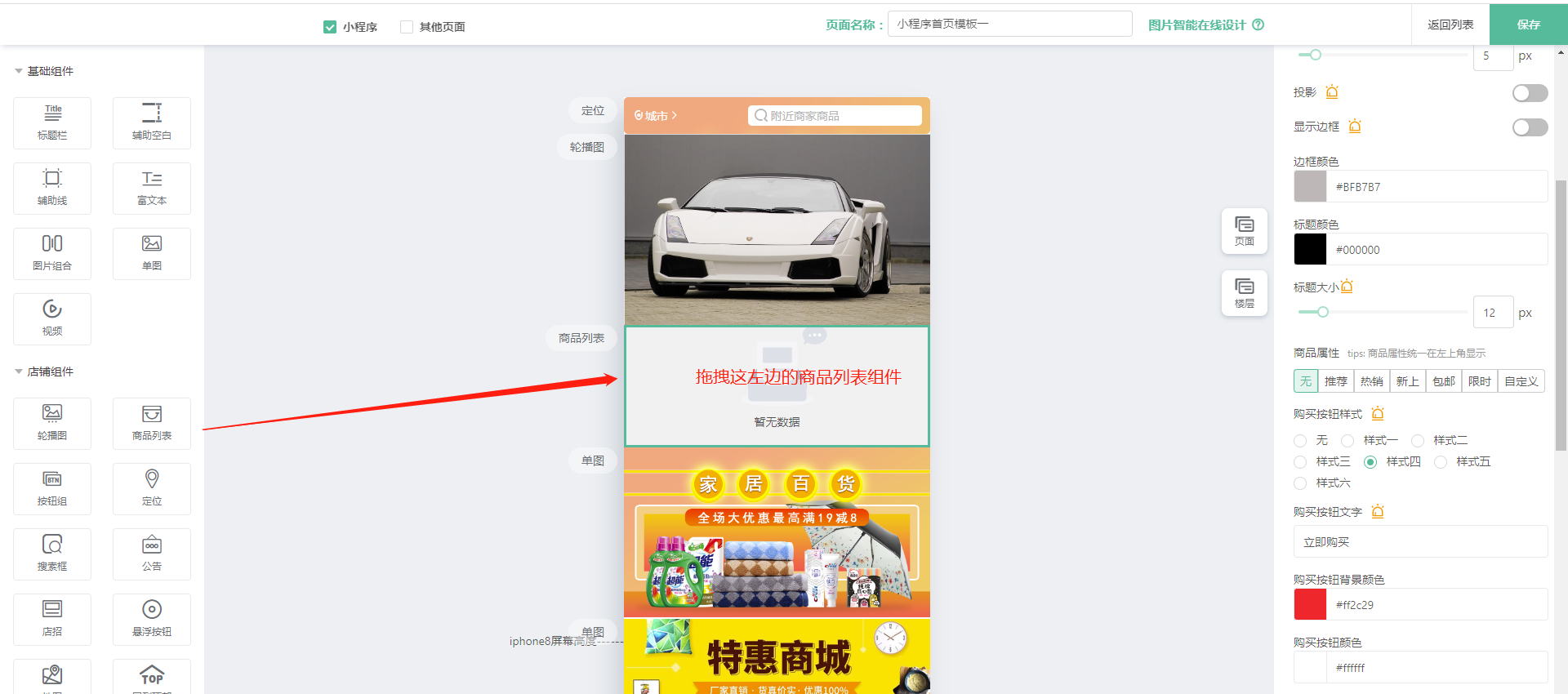 ②有三种方法可以展示前端,第一:拖拽左边组件:商品列表到中间首页模板的区域