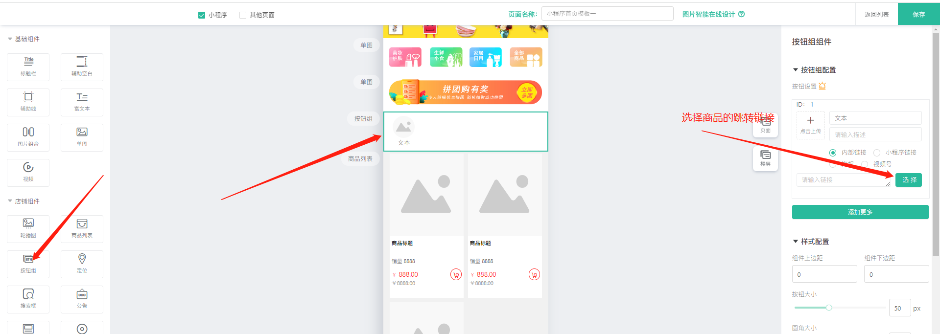⑦、第二种,可以拖动按钮组,按钮组这个可以选择商品的分类或者是创建商品的二级页面,把商品的二级页面链接粘贴到按钮组去,如何创建二级页面可以参考该文档:http://doc.yingzaizhijian.com:8181/docs/hzkfb20230620/hzkfb20230620-1fopv3knilj5m