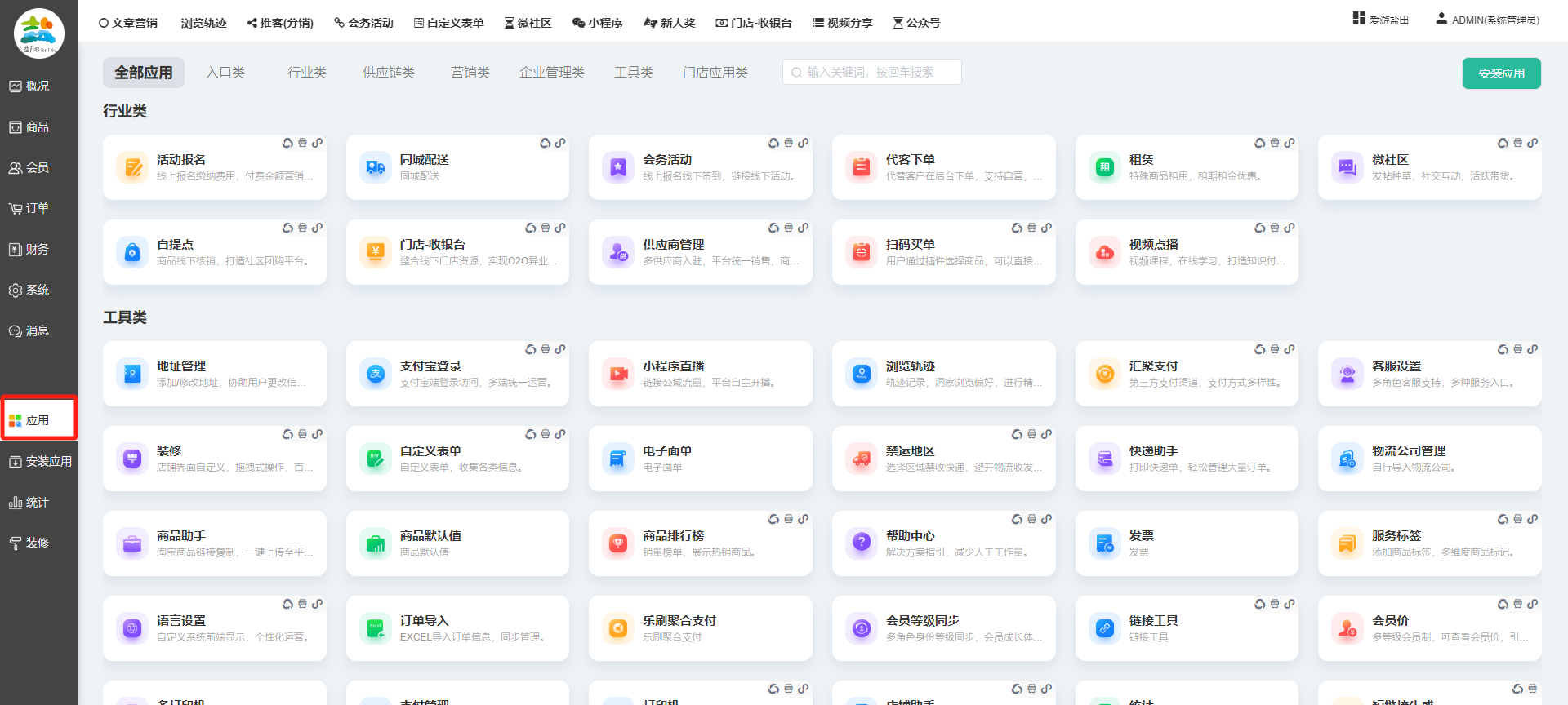 目录 搜索 展开 一、前期准备资料二、数字乡村码-上线操作指南1、服务号的申请流程及认证2、申请小程序流程3、开放平台绑定小程序和公众号三、数字乡村码-系统操作数字乡村码系统管理-概况数字乡村码-商品管理1、发布商品2、商品列表3、商品表单4、商品分类5、品牌管理6、配送模板7、评论管理8、优惠券管理9、商品标签10、退货地址设置11、满额优惠12、批量操作13、配送方式14、基础设置15、商品隐藏四、数字乡村码-会员管理1、全部会员2、会员等级3、会员分组4、资格申请5、会员设置6、推广中心设置7、会员邀请码8、会员关系链修改关系链修改记录9、会员合并记录10、账号注销管理11、会员设置中心五、数字乡村码-订单管理1、订单管理列表2、订单处理流程3、订单状态4、订单修改价格5、订单退款退货6、多包裹发货7、批量发货订单操作步骤8、催发货订单9、物流查询六、数字乡村码-财务管理1、余额设置2、会员余额3、充值记录4、转让记录5、余额明细6、收入明细7、提现设置8、提现统计9、积分管理10、转账审核11、收益广告12、批量充值七、数字乡村码-系统管理1、商城入口2、商城设置①、商城设置②、订单设置③、物流查询④、短信⑤、联系方式⑥、分类⑦、优惠券⑧、分享⑨、幻灯片⑩、广告位⑫、地图设置3、交易设置4、微信模板消息自定义消息模板(新版)自定义消息模板(旧版)小程序消息模板公众号模板消息变更公告5、语言设置6、权限管理7、多媒体管理八、数字乡村码-消息管理九、数字乡村码-应用管理十、数字乡村码系统-数据统计十一、数字乡村码-页面装修DIY1、模板管理2、店铺页面3、顶部导航4、底部导航5、DIY模板市场6、首屏广告7、基础设置8、装修DIY尺寸建议十二、供应商功能插件操作指南1、供应商2、门店-收银台门店申请和使用步骤门店管理①、门店-收银台 营销设置②、门店-收银台 分润设置门店分类门店申请门店审核门店商品门店商品订单收银台订单数据统计核销员基础设置默认设置门店装修3、微社区4、会务活动十三、营销插件操作指南活动报名提货卡新人奖微店问卷调查积分视频分享1、视频分享基础设置2、视频分享发现管理3、视频分享分类管理4、视频分享评论管理5、视频分享分红记录6、视频分享短视频中心每日红包幸运大抽奖签到优惠券二维码任务奖励优惠劵文章音频文章付费文章限时购新海报拓客卡操作流程积分活动素材中心视频红包十四、入驻门店应用类1、门店预约2、附近商品3、门店定位设置4、门店控制5、门店满额包邮6、门店满额减7、导入商品8、门店搜索9、门店股东10、核销券11、多门店核销1、商城后台设置2、前端功能演示十五、常见问题1、后台登录密码修改流程2、会员-余额,积分,后台如何进行充值与扣除3、如何修改上下级关系4、一种万能的获取商城小程序路径的方法 暂无相关搜索结果! 阅读次数:1464 本文档使用 模王系统 发布 九、数字乡村码-应用管理 九、商城管理-应用显示所有商城已安装并启用的应用,包含以下大类:具体根据自家商城后台系统显示为准。每个应用功能设置步骤较多,请查看相对应应用的学习文档。文档更新时间: 2024-01-08 10:36 作者:链上旅行