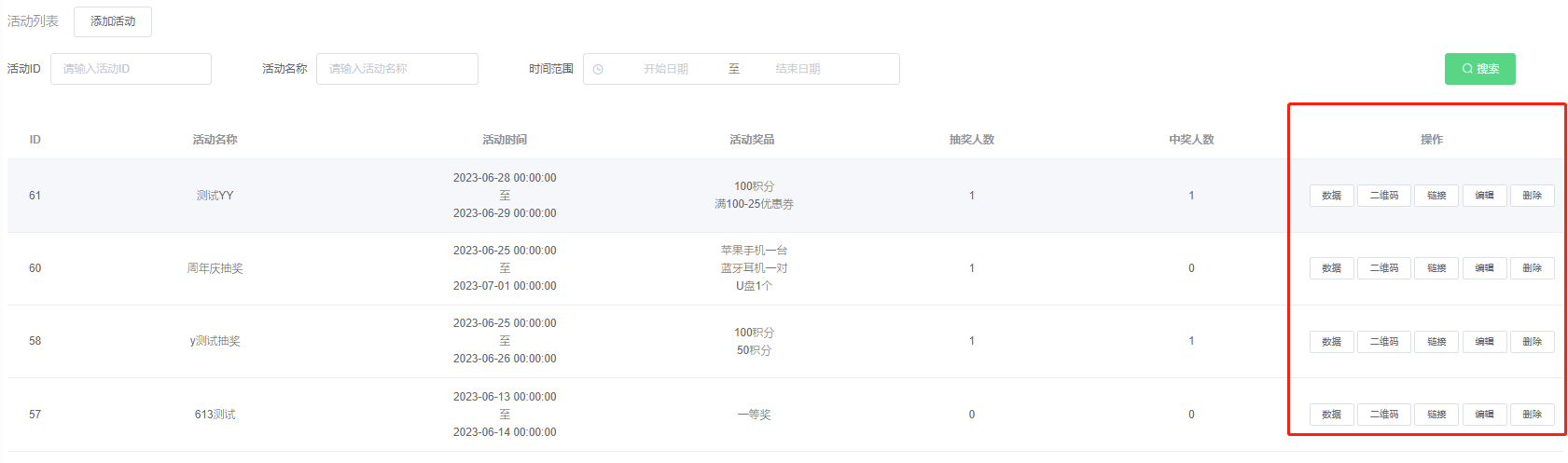 抽奖成功后可在后台活动列表—数据处查看获奖数据【只显示获奖的数据,未获奖数据不显示】