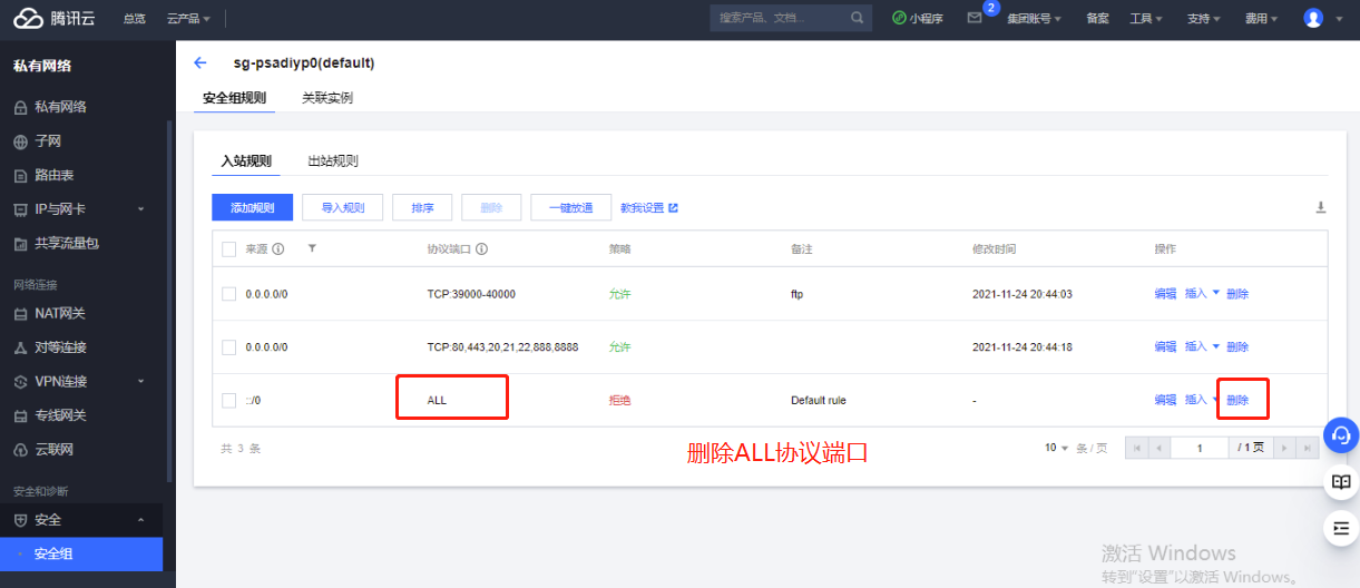 3:服务器安全组开放端口配置:实例-安全组-修改规则:0.0.0.0/0 [TCP:22,888,8888,465,80,443,20,21][TCP:39000-40000]