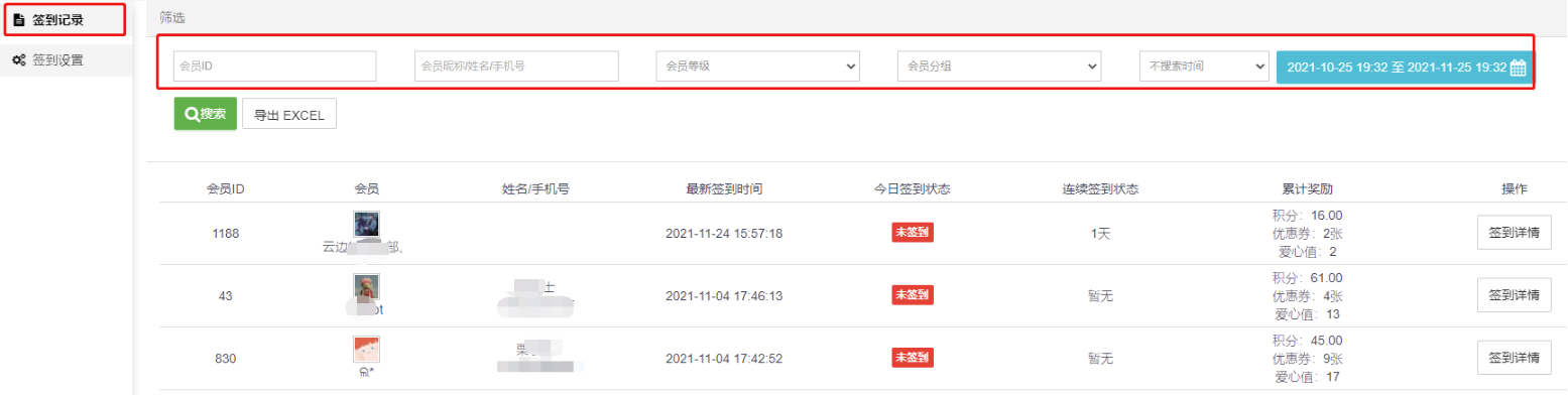 2)点击会员签到记录--签到详情,可以查看该会员的签到详情,显示每一个会员所有的签到记录及详情:记录ID、签到时间、奖励积分、奖励优惠券、备注(奖励的详细信息);3)会员签到记录支持搜索筛选导出操作;