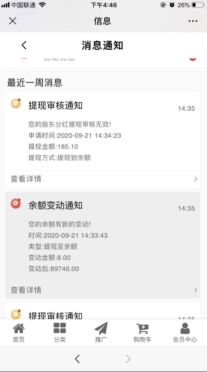 用户在前端会员中心--消息栏目中可以查看交易物流、提现通知、申请通知、客户通知、资产通知、服务通知、订单提醒、客服通知、后台推送的活动优惠等信息。