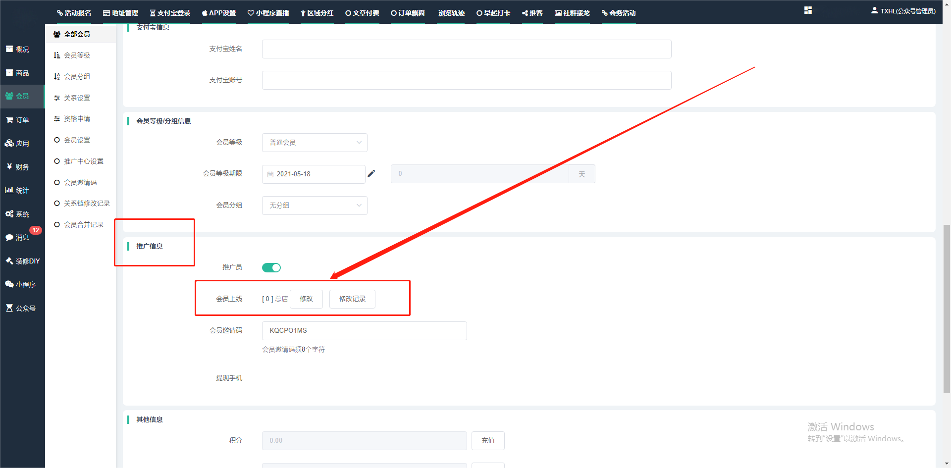目录 搜索 展开 一、前期准备资料二、数字乡村码-上线操作指南1、服务号的申请流程及认证2、申请小程序流程3、开放平台绑定小程序和公众号三、数字乡村码-系统操作数字乡村码系统管理-概况数字乡村码-商品管理1、发布商品2、商品列表3、商品表单4、商品分类5、品牌管理6、配送模板7、评论管理8、优惠券管理9、商品标签10、退货地址设置11、满额优惠12、批量操作13、配送方式14、基础设置15、商品隐藏四、数字乡村码-会员管理1、全部会员2、会员等级3、会员分组4、资格申请5、会员设置6、推广中心设置7、会员邀请码8、会员关系链修改关系链修改记录9、会员合并记录10、账号注销管理11、会员设置中心五、数字乡村码-订单管理1、订单管理列表2、订单处理流程3、订单状态4、订单修改价格5、订单退款退货6、多包裹发货7、批量发货订单操作步骤8、催发货订单9、物流查询六、数字乡村码-财务管理1、余额设置2、会员余额3、充值记录4、转让记录5、余额明细6、收入明细7、提现设置8、提现统计9、积分管理10、转账审核11、收益广告12、批量充值七、数字乡村码-系统管理1、商城入口2、商城设置①、商城设置②、订单设置③、物流查询④、短信⑤、联系方式⑥、分类⑦、优惠券⑧、分享⑨、幻灯片⑩、广告位⑫、地图设置3、交易设置4、微信模板消息自定义消息模板(新版)自定义消息模板(旧版)小程序消息模板公众号模板消息变更公告5、语言设置6、权限管理7、多媒体管理八、数字乡村码-消息管理九、数字乡村码-应用管理十、数字乡村码系统-数据统计十一、数字乡村码-页面装修DIY1、模板管理2、店铺页面3、顶部导航4、底部导航5、DIY模板市场6、首屏广告7、基础设置8、装修DIY尺寸建议十二、供应商功能插件操作指南1、供应商2、门店-收银台门店申请和使用步骤门店管理①、门店-收银台 营销设置②、门店-收银台 分润设置门店分类门店申请门店审核门店商品门店商品订单收银台订单数据统计核销员基础设置默认设置门店装修3、微社区4、会务活动十三、营销插件操作指南活动报名提货卡新人奖微店问卷调查积分视频分享1、视频分享基础设置2、视频分享发现管理3、视频分享分类管理4、视频分享评论管理5、视频分享分红记录6、视频分享短视频中心每日红包幸运大抽奖签到优惠券二维码任务奖励优惠劵文章音频文章付费文章限时购新海报拓客卡操作流程积分活动素材中心视频红包十四、入驻门店应用类1、门店预约2、附近商品3、门店定位设置4、门店控制5、门店满额包邮6、门店满额减7、导入商品8、门店搜索9、门店股东10、核销券11、多门店核销1、商城后台设置2、前端功能演示十五、常见问题1、后台登录密码修改流程2、会员-余额,积分,后台如何进行充值与扣除3、如何修改上下级关系4、一种万能的获取商城小程序路径的方法 暂无相关搜索结果! 阅读次数:1544 本文档使用 模王系统 发布 3、如何修改上下级关系 如何修改上下级关系一.如何修改上下级关系?1.会员-全部会员-可以通过搜索用户的独立ID,或者用户微信昵称,找到此会员,然后点击右边的(操作)2.再点击会员详情。3.滑到下面,有个推广信息-会员上线,点击修改4.输入上级的ID号,点击搜索,出来此上级会员后点击选择。5.滑到最下面,一定要点击提交按钮。文档更新时间: 2024-01-05 14:50 作者:链上旅行